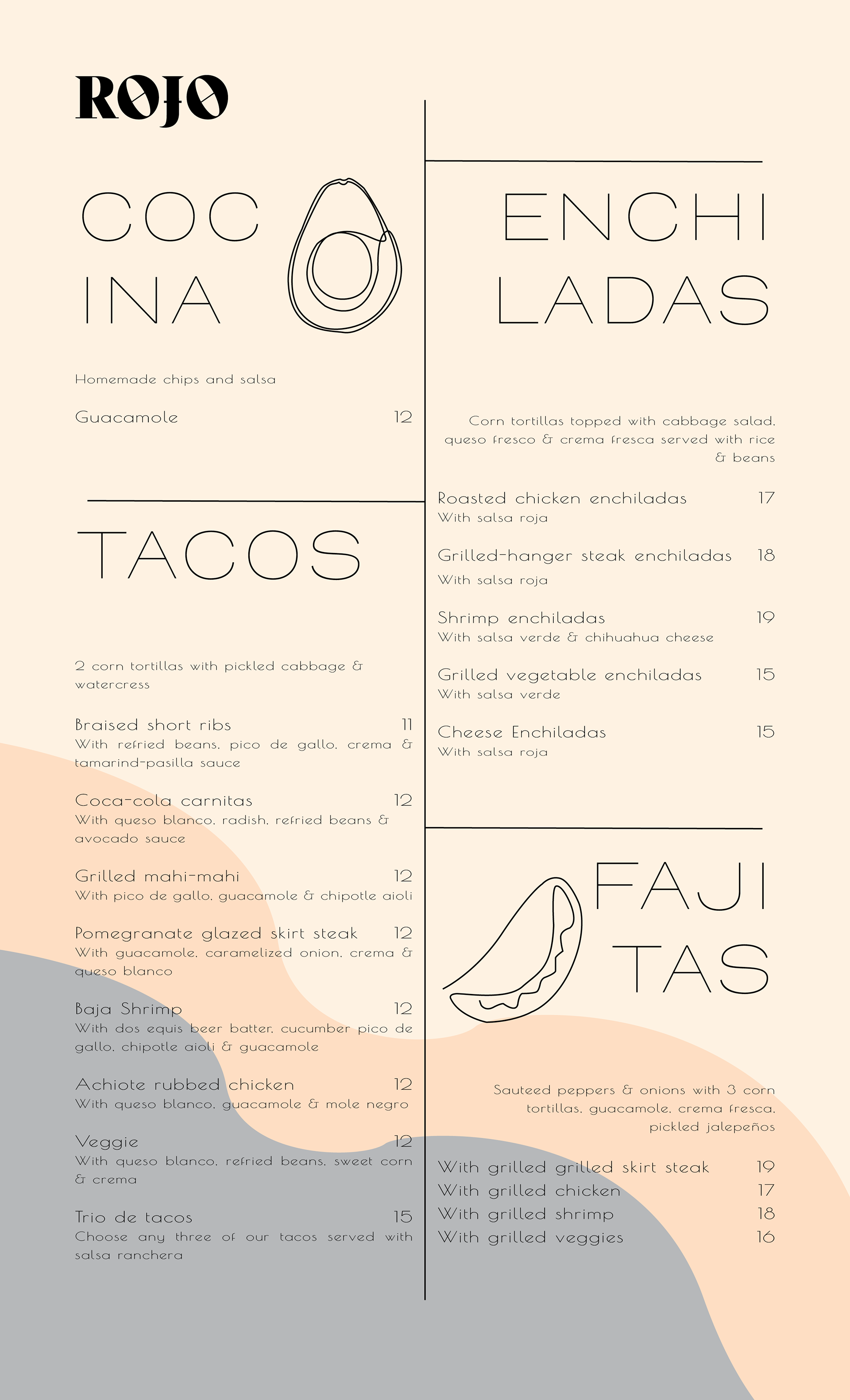 I'm thrilled to share my inspiration behind the menu design for ROJO, an excellent Mexican restaurant I'm excited to create this design. I wanted to capture the essence of Mexican cuisine while infusing a touch of sophistication. Using neutral colours like warm browns and soft creams, I aimed to create a subtle backdrop that allows the dishes to truly stand out. Additionally, I incorporated artistic line imagery, adding a chic and modern flair to the menu. These elements not only enhance the overall aesthetic but also reflect the rich and diverse flavours the guests can expect at ROJO.