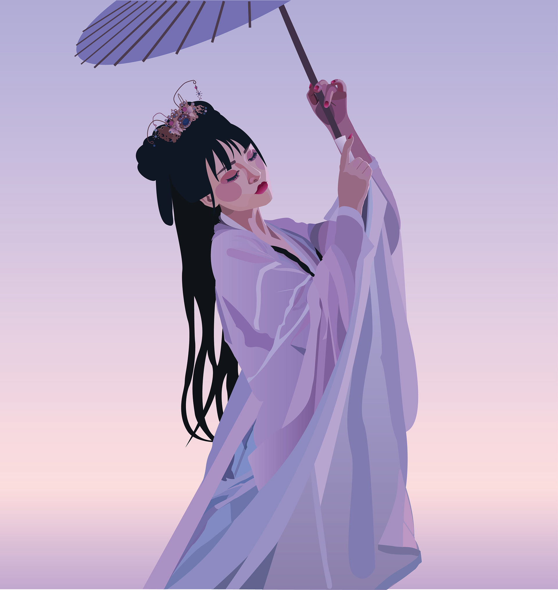 Since I was young, I have always had a fascination with Japanese culture. I love blooming cherry blossoms, traditional Japanese garbs and so much more. I created this piece with the intention of paying homage to that. I wanted to convey the beauty I see with others, and decided making a modern-day Geisha was an interesting way to do that. I decided to use a colour scheme of pink, blues, and purples to give the image a calming and serene look. I wanted her to appear like she was at peace, and I hope that her facial expression communicated that. I created this piece using adobe illustrator, and the whole piece took roughly 15 hours.
